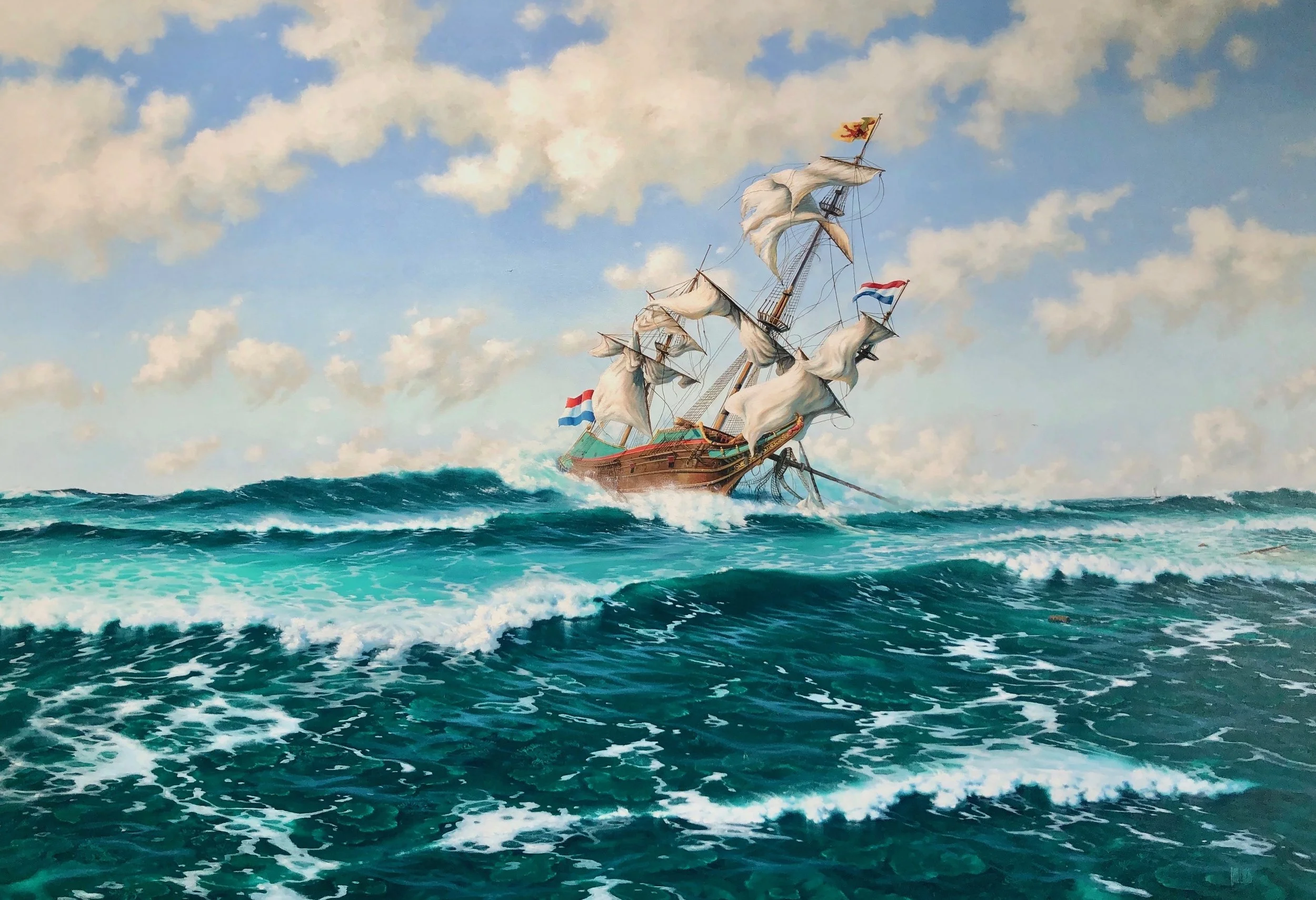 The ‘All Hope is Lost’ is the second in the series. It shows a mid morning scene of the ship’s crew having launched the Batavia’s life boat to investigate the nearby islands for possible soon to be required shelter, water and food., with the ship shown at sunrise and them realising their grave situation.